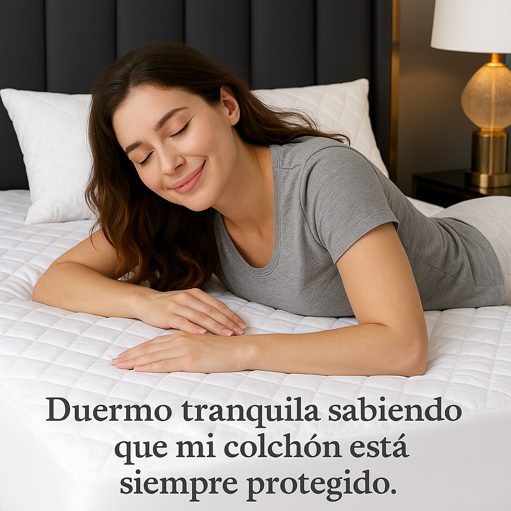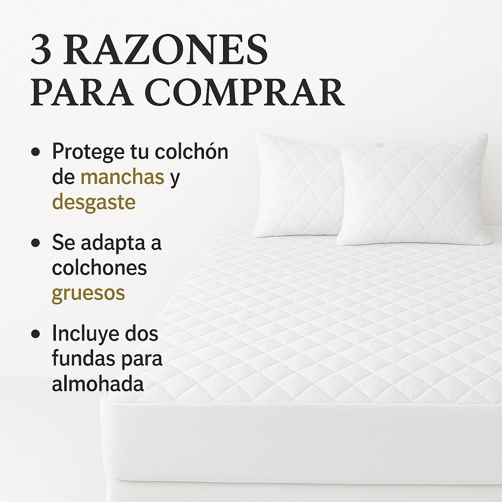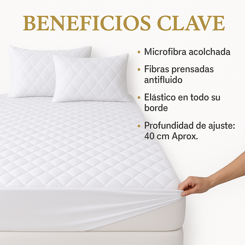 Ficha técnica:Microfibra acolchada con fibras prensadas antifluido (protege tu colchon de saliva, sudor y fluidos corporales).Elástico en todo su borde (no tiene cremallera).Profundidad de ajuste: 40 cm Aprox.NOTA: NO ES IMPERMEABLE. LAS FUNDAS ESTÁN INCLUIDASMEDIDAS:Sencillo: 1.00cm*1.90cm / Altura 40cmSemidoble: 1.20cm*1.90cm / Altura 40cmDoble: 1.40cm*1.90cm / Altura 40cmQueen: 1.60cm*1.90cm / Altura 40cmKing: 2.00cm*2.00cm / Altura 40cm IMPORTANTE:1. Los colores de las fotografías pueden presentar pequeñas variaciones en el tono del color, en el diseño de la tela y en el acolchado con relación al producto físico.2. La medida puede variar (+/- 2cm).